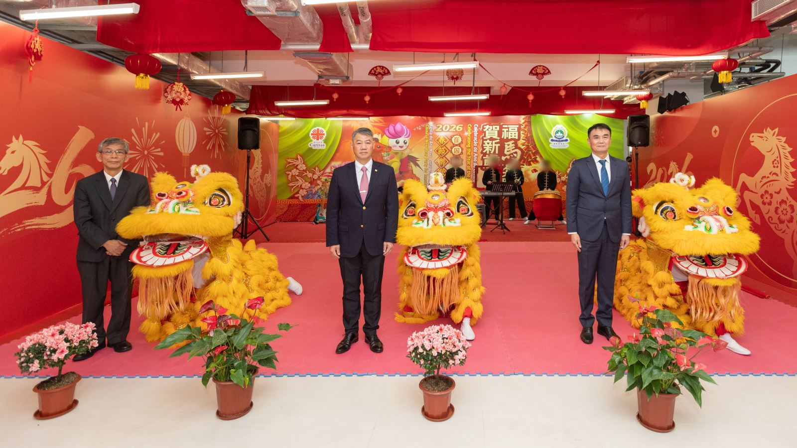 警察總局局長梁文昌、懲教管理局局長程况明及澳門明愛總幹事潘志明為醒獅點睛