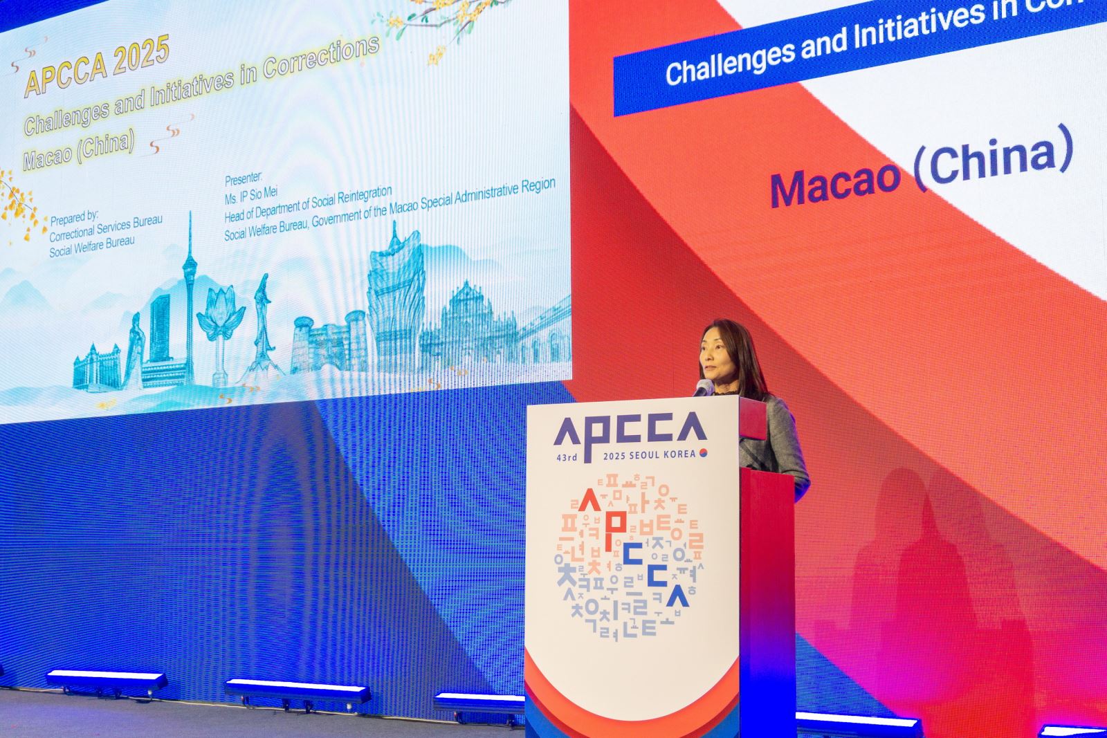 De 9 a 14 de Novembro de 2025, uma delegação de oito representantes da Direcção dos Serviços Correccionais (DSC) e do Instituto de Acção Social (IAS), liderada pelo Director da DSC, Cheng Fong Meng, deslocou-se à Coreia do Sul para participar na 43.ª Conferência de Dirigentes dos Serviços Correccionais da Ásia-Pacífico (APCCA), organizada pela Administração de Correcção da Coreia do Sul. O tema desta edição é “Criar Novas Correcções Com Novos Pensamentos”. O evento contou com a participação de dirigentes e representantes dos serviços correccionais de 28 países, regiões e organizações profissionais da Ásia-Pacífico, totalizando cerca de 140 pessoas, para trocarem ideias e discutirem questões relacionadas com a administração correccional, partilharem experiências práticas e fortalecerem mutuamente os laços, promovendo o desenvolvimento sustentável do trabalho correccional.