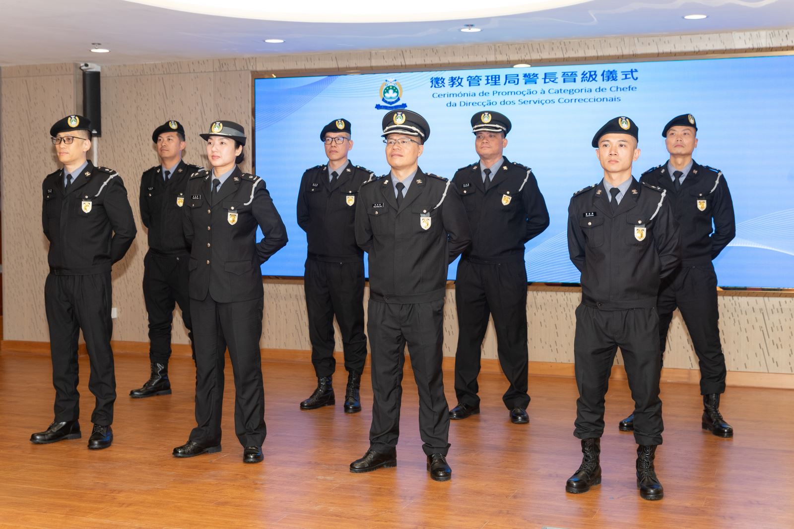 Desta vez, foram promovidos para a categoria de chefe oito elementos, incluindo: Lai Chi Meng, Leng Wai Teng, U Ka Hoi, Chou Ka Chon, Tang Chong Leng, Lo Cheok Wai, Che Wong Fat e Ng Cheok Wai. Os recém-promovidos foram aprovados nas provas, depois de terem concluído o curso de formação de acesso e o estágio, com a duração de 6 meses. O curso de formação profissional inclui: Administração prisional moderna, Informações de segurança, Planeamento de negociação, Tendência e gestão de crimes de droga, Gestão de administração pública, Regime jurídico da função pública, Organização e coordenação de eventos, etc.