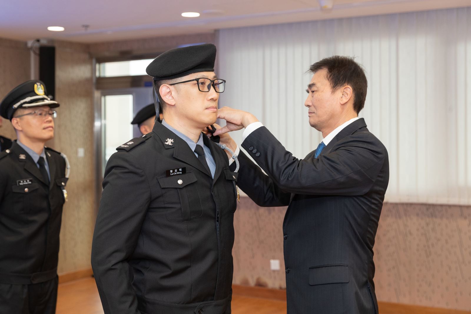 Aposição de distintivos ao chefe recém-promovido com melhor classificação, Lai Chi Meng, pelo Director Cheng Fong Meng